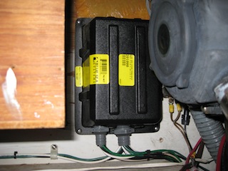 Galvanic Isolator This was a pretty easy project. Total time was about 2 hrs, and part of that was spent hunting for the crimp connectors. But first some background. Soner or later, every boat owner gets introduced to the galvanic corrosion that happens when you put two dissimiliar metals that are electrically connected into saltwater. You quickly learn to install and maintain an appropriate number of zincs to protect your valuable underwater hardware, such as through-hulls and prop shafts. What some don't know, however, is that it's possible to do everything right and still have galvanic corrosion! The problem happens when you're connected to shore power. Even if all your A/C devices, like your battery charger, are transformer isolated, there's still the safety ground. This is connected directly to your boat's system ground, to which all your underwater hardware is bonded. As a result your boat's ground, through the marina's wiring, is now connected to every other boats grounds and hardware! And if any of them aren't properly protected, they'll cause a galvanic current that'll start eating your zincs! This uses them up too quickly, and then least noble of your hardware starts going. The obvious solution is to disconnect the safety ground. But this is a serious safety hazard unless you are absolutly sure that everything is transformer isolated, and remains that way. So, what we really want, is something in series with the safety ground that doesn't conduct most of the time, but will conduct the full service current in case of a short. It turns out that there is such a device. It depends on the fact that virtually all galvanic circuits are driven by only a few tenths of a volt. A silicon diode drops about 0.6 volt. Below this, it doesnt conduct at all. Above this, it conducts heavily. Since 0.6 volt isn't really enough, we put two in series for 1.2 volt. And since diodes only conduct in one direction, we put another pair in parallel in the opposite direction. This is basis of a galvanic isolator. Real-world devices are more complicated, including things like fail-safe, A/C leakage bypass, and monitoring. But at their heart, there are four diodes. So, now on to the actual project! After some research, I chose the Yandina GI-50N. This is a no-frills, 50-Amp unit from Yandina Ltd.