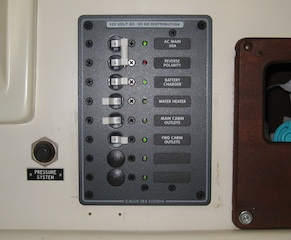 ![]() The switch that is visible in the square cutout is the DC power for the cold-plate referigeration system that was installed by a previous owner. The first part of this project was coming up with a plan. I wanted to install a modern circuit-breaker-based panel with breakers for the main and at least four individual branch circuits. It looked like there would be room for this where the outlet, water-heater switch, and cold-plate switch were located. The outlet and cold-plate switch would have to be relocated, and the hot water switch could be eliminated as it's function would be taken over by one of the breakers. After looking at many panels, I selected the Blue Sea 8027 panel. This panel provides a dual-breaker 30 Amp main, three 15 Amp breakers, and provides space for 3 more. It also provides power-on indicators for the main and all breakers, a reverse-polarity indicator, label backlights, and a set of 30 labels. And it's dimensions were compatable whth the space I had available. I orderded it, along with an extra 15 Amp breaker, from Defender, as they had the best price by far. I also purchased the back panel cover to go with it.